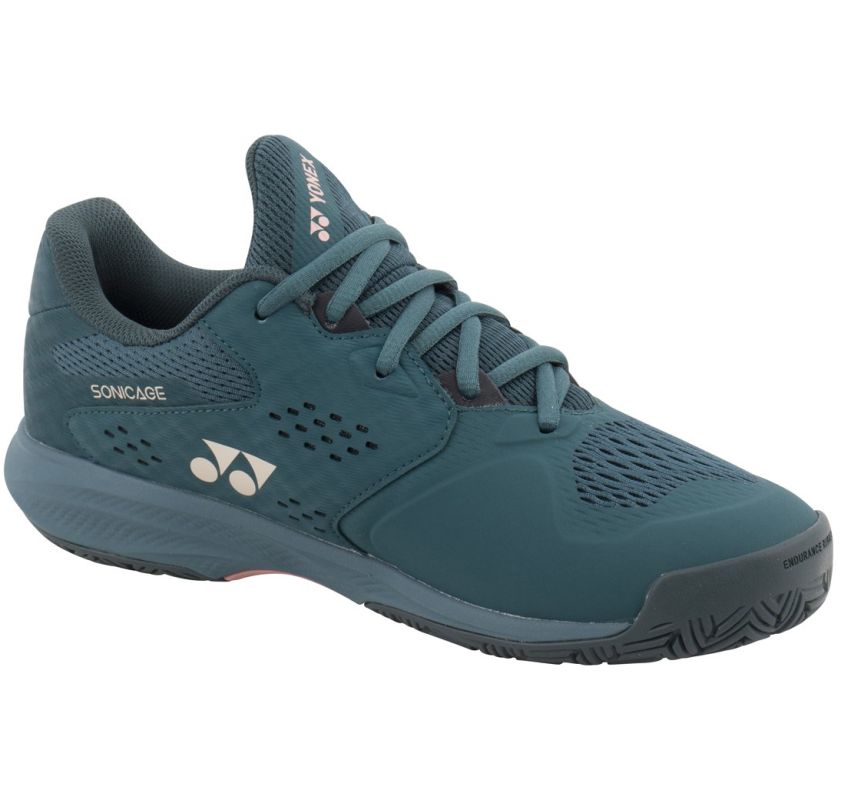 Женские теннисные кроссовки Yonex Power Cushion Sonicage - dark green. Легкая и комфортная модель с идеально облегающим стопу кроем. Модифицированный верх обеспечивает еще лучшие характеристики, особенно в плане стабилизации стопы. Зоны mesh-панели обеспечивают повышенную воздухопроницаемость, что повышает комфорт во время игры. В ключевых местах применены специальные усиления. Отличная амортизация благодаря признанной технологии POWER CUSHION +. Язычок частично выполнен из mesh-панели и частично интегрирован с верхом, что обеспечивает лучшее прилегание и дополнительную поддержку стопы. Применены следующие технологии: ROUND SOLE, TOE ASSIST SHAPE, DURABLE SKIN, POWER GRAPHITE, ENDURANCE RUBBER. Обувь имеет универсальную подошву с системой non-marking.