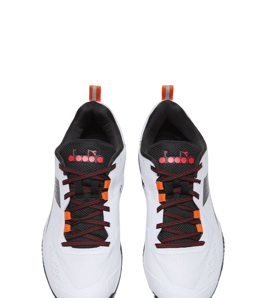 Теннисные кроссовки Diadora Blushield Torneo AG - white/black/fiery red. Зоны mesh-панели увеличивают вентиляцию. Отличная стабилизация и амортизация. В ключевых зонах применены дополнительные усиления. Интегрированный язычок дополнительно фиксирует стопу в обуви, повышая стабильность. Применены следующие технологии: CCB, DURATECH 500, D-SKIN, SUPRELLTECH, BLUSHIELD.
