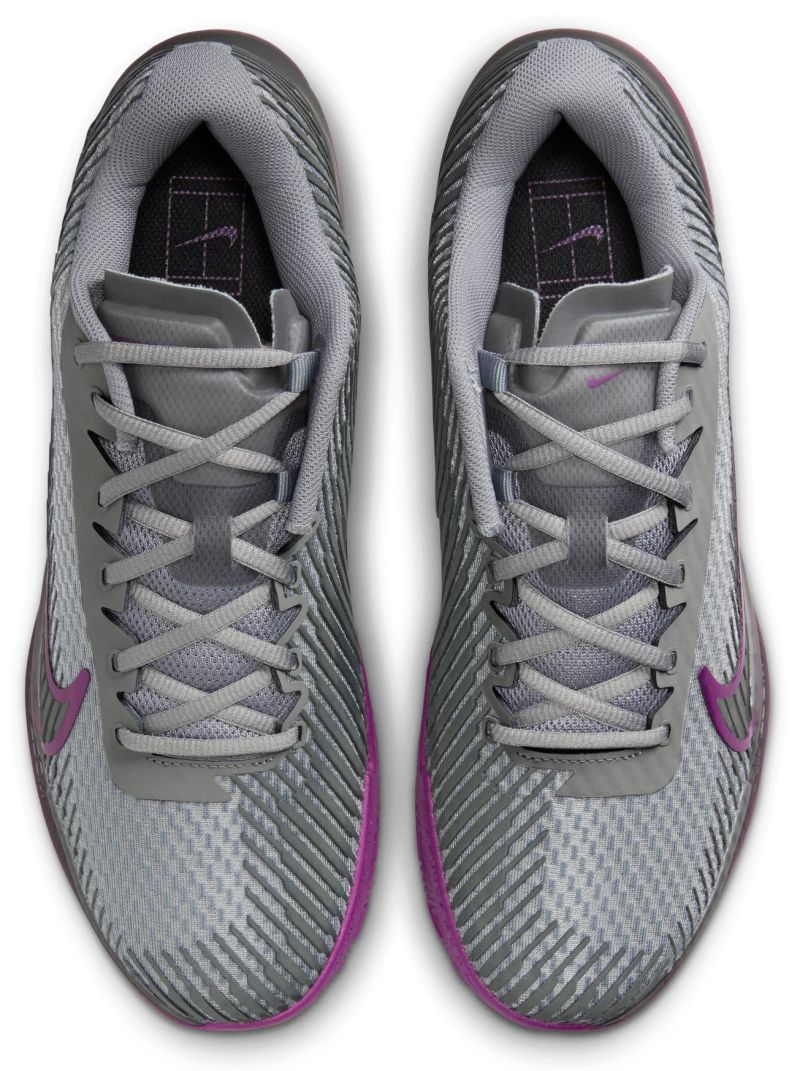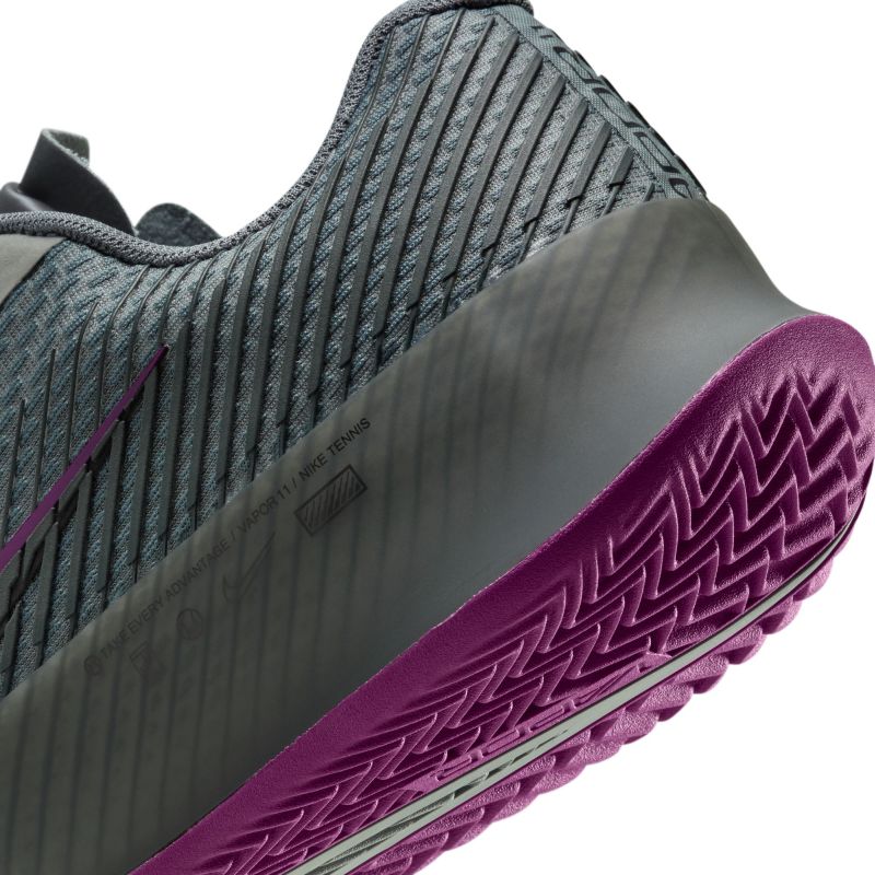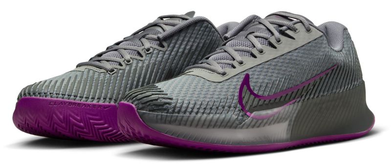 Теннисные кроссовки Nike Zoom Vapor 11 Clay. Следующая версия культовой серии обуви Air Zoom Vapor. Модель Vapor 11 обеспечивает идеальное сочетание комфорта, долговечности и динамики. Верх выполнен из эластичного сетчатого материала, что обеспечивает отличную воздухопроницаемость. Конструкция из сетчатой панели усилена в соответствующих местах, благодаря чему сохраняется прочность. Кроме того, резиновый слой подошвы в средней части обуви приподнят, что позволяет укрепить области с наибольшим износом и увеличить поддержку стопы. Тонкий язычок и внутренняя полусапожка до половины верха облегчают надевание и снятие обуви, что повышает удобство использования. В передней части обуви применена воздушная подушка Zoom Air, которая обеспечивает хорошую амортизацию, упругость и динамику отскока. Из областей, менее подверженных износу, удалена резина, что позволяет минимизировать вес и выполнять быстрые движения и молниеносные повороты. Обувь имеет классическую систему шнуровки. Ввиду профиля протектора модель предназначена для игры на грунтовых кортах.