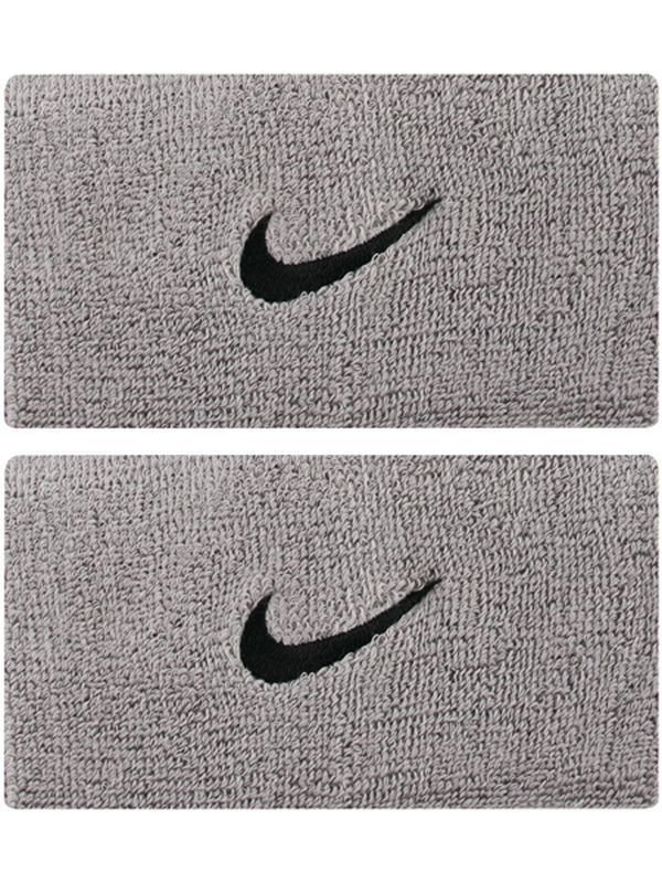 Nike Swoosh Double-Wide Wristbands - матовый серебристый/черный. Теннисные фроттовые повязки отлично впитывают влагу, прекрасно прилегают к запястьям. Длина повязки - 13 см. Упакованы по две штуки.