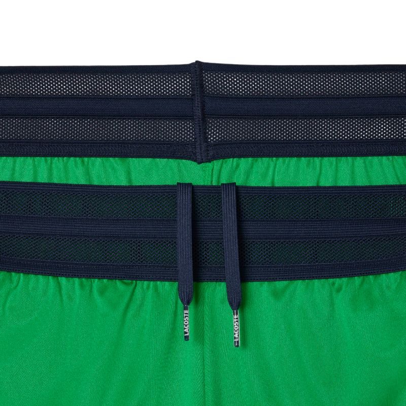Мужские шорты Lacoste Ultra Dry Stretch Tennis. Комфортные и стильные шорты выполненные в регулярном крое, с прямой штаниной. Широкий пояс выполненный из сетчатого материала с внутренним шнурком позволит идеально подогнать по фигуре, обеспечивая высокий комфорт во время игры. Два глубоких боковых кармана. Сетчатая панель позволит на лучшую воздухопроницаемость. Шорты выполнены из легкого материала с применением технологий: ULTRA DRY, STRETCH.