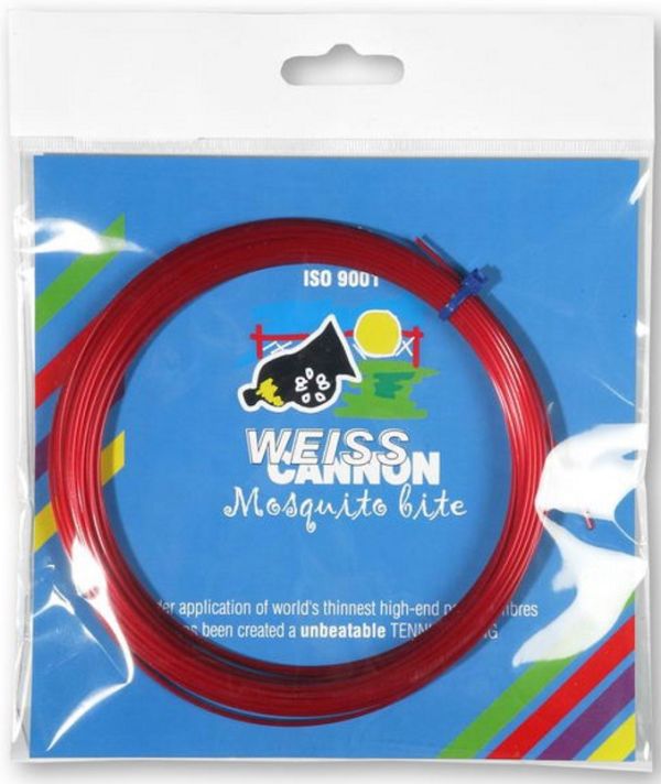 Струны теннисные Weiss Cannon Mosquito bite (12 m) - red. Струна, в которой истинные поклонники тенниса найдут множество преимуществ. Несмотря на небольшую толщину, она характеризуется хорошей прочностью и малой потерей натяжения струн, а её доминирующими свойствами являются: большой "power" и контроль. В ней также имеется большой потенциал для ротационной игры. Рекомендуется натягивать ракетку на 8% легче по сравнению с другими струнами из полимерных волокон.